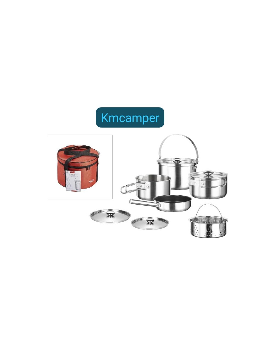 Contiene: 1 olla Ø 20cm, 1 cazo Ø 16cm, 1 cazo Ø 14cm, 1 sartén Ø 20cm, 1 cestillo Ø 18cm, 2 tapas 1 de Ø16cm y 1 de Ø 20cm, 1 mango desmontable + 1 bolsa de transporte.